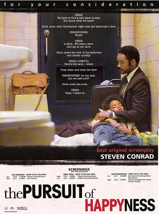 克里斯•加纳(威尔·史密斯 Will Smith 饰)用尽全部积蓄买下了高科技治疗仪,到处向医院推销,可是价格高昂,接受的人不多。就算他多努力都无法提供一个良好的生活环境给妻儿,妻子(桑迪·牛顿 Thandie Newton 饰)最终选择离开家。从此他带着儿子克里斯托夫(贾登·史密斯 Jaden Smith 饰)相依为命。克里斯好不容易争取回来一个股票投资公司实习的机会,就算没有报酬,成功机会只有百分之五,他仍努力奋斗,儿子是他的力量。他看尽白眼,与儿子躲在地铁站里的公共厕所里,住在教堂的收容所里…… 他坚信,幸福明天就会来临收起
